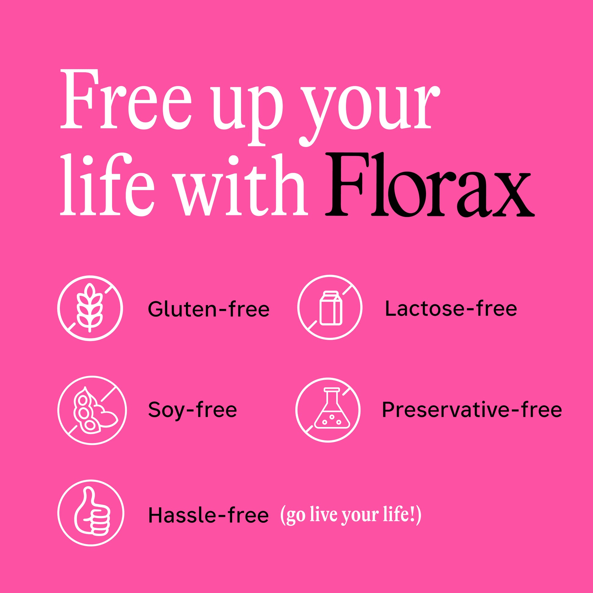 【FREE UP YOUR LIFE WITH FLORAX】Our formula offers freedom in every sense of the word: we are gluten-free, soy-free, preservative-free, lactose-free, and above all, hassle free. Our products are shelf-stable and do not need to be refrigerated, so you can go live your life!